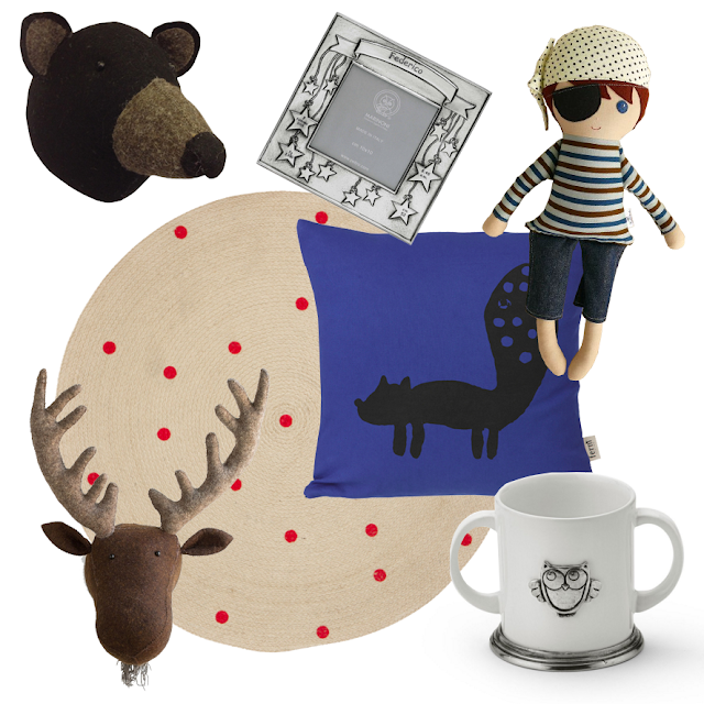 FOR KIDS: baby mug - portaritratti personalizzato - cuscino blu FERM LIVING - tappeto FERM LIVING - teste di animale di peluche da appendere al muro SCANDICHIC - bambolotto pirata in stoffa fatto a mano